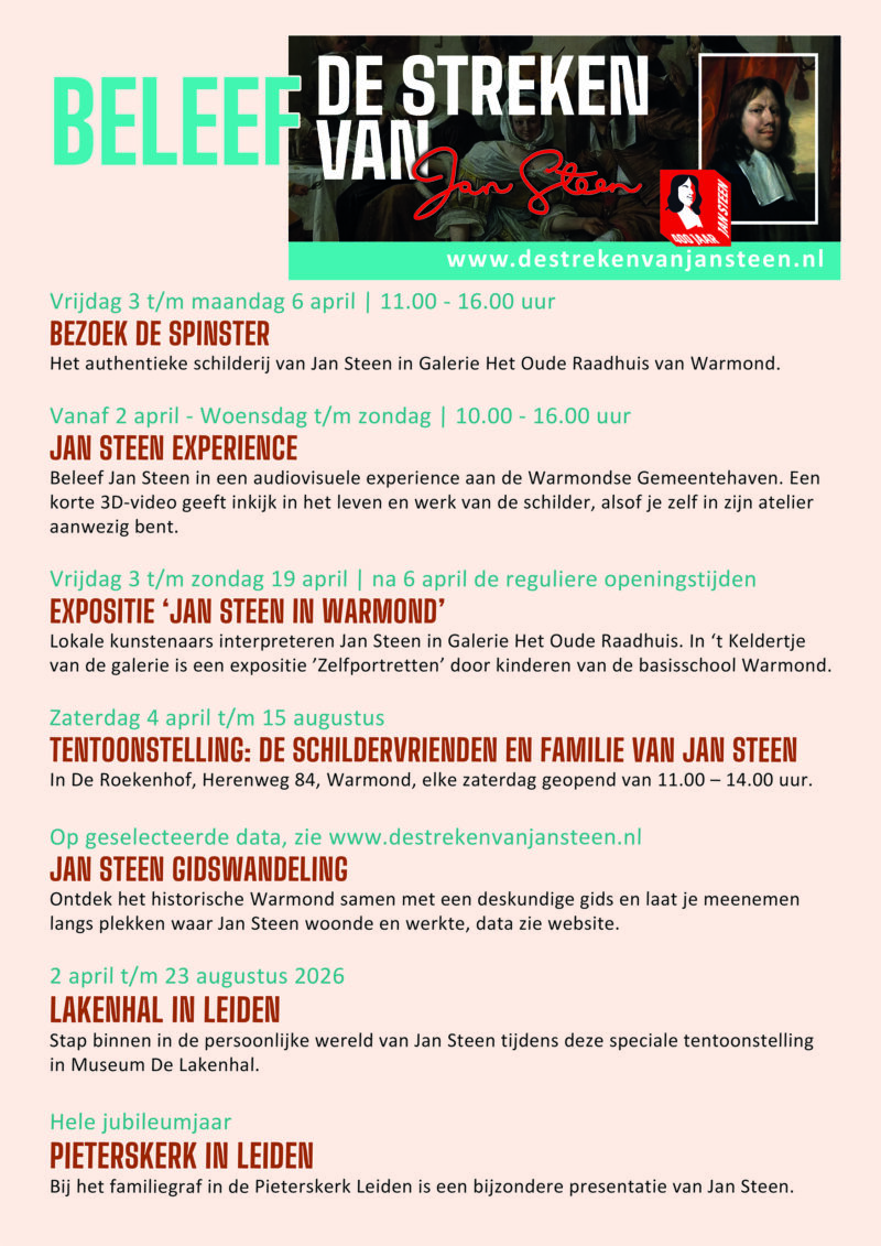 In 2026 is het precies 400 jaar geleden dat Jan Steen in Leiden werd geboren (1626). Dit jubileumjaar van Jan Steen wordt breed gevierd in Leiden en Warmond, waar Steen ook enige tijd heeft gewoond. Het hele jaar door worden er activiteiten georganiseerd in het teken van Jan Steen en uiteraard zullen wij daarbij aansluiten. Om die reden hebben wij gekozen voor het thema: ‘Leven in de brouwerij’